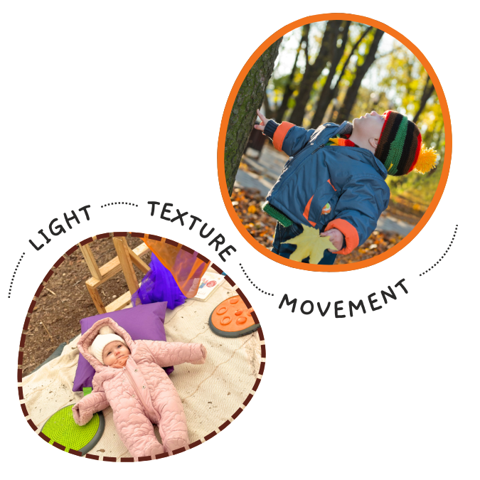 - Baby-led sensory exploration using natural materials such as leaves, bark, soil, water and seasonal treasures