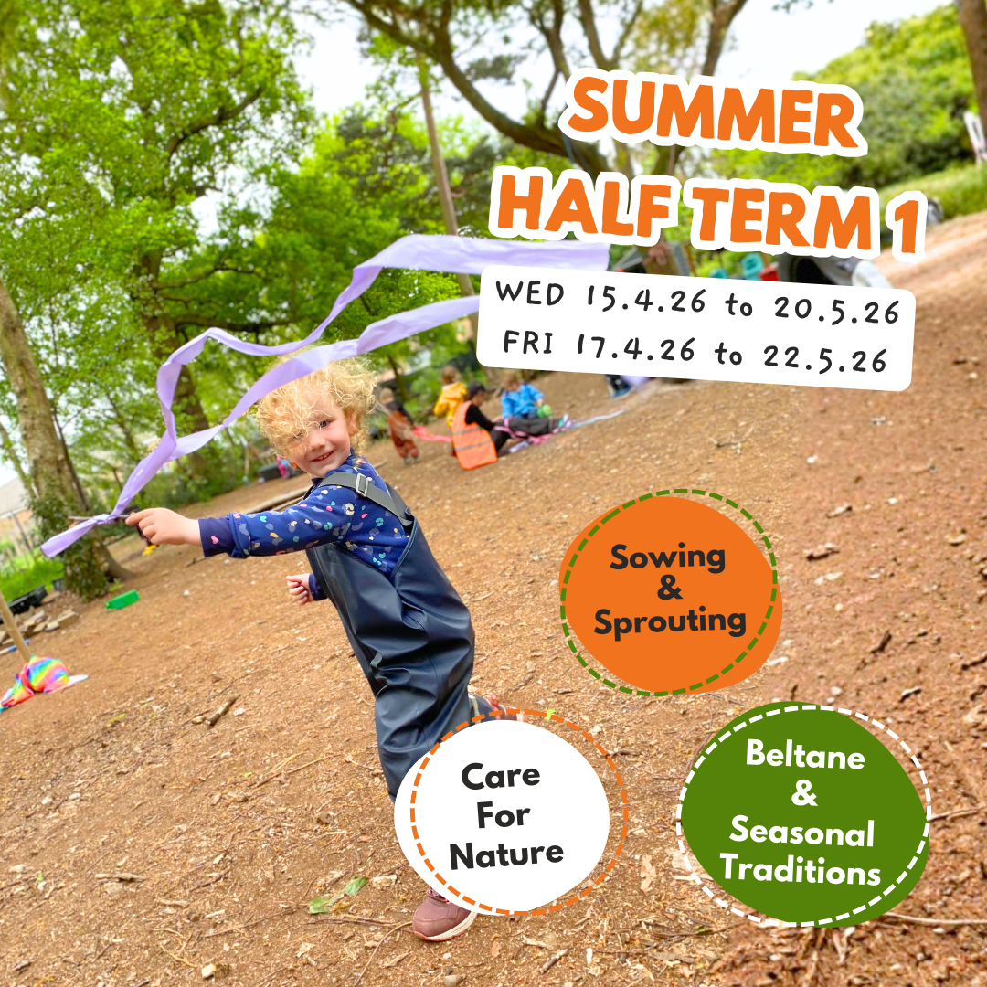 This half-term celebrates growth in motion as spring unfolds into early summer, inviting your child to explore planting, tending and caring for the natural world. Through seasonal activities inspired by Beltane and 30 Days Wild, children will connect with the land through movement, sensory discovery and shared moments in the woodland.