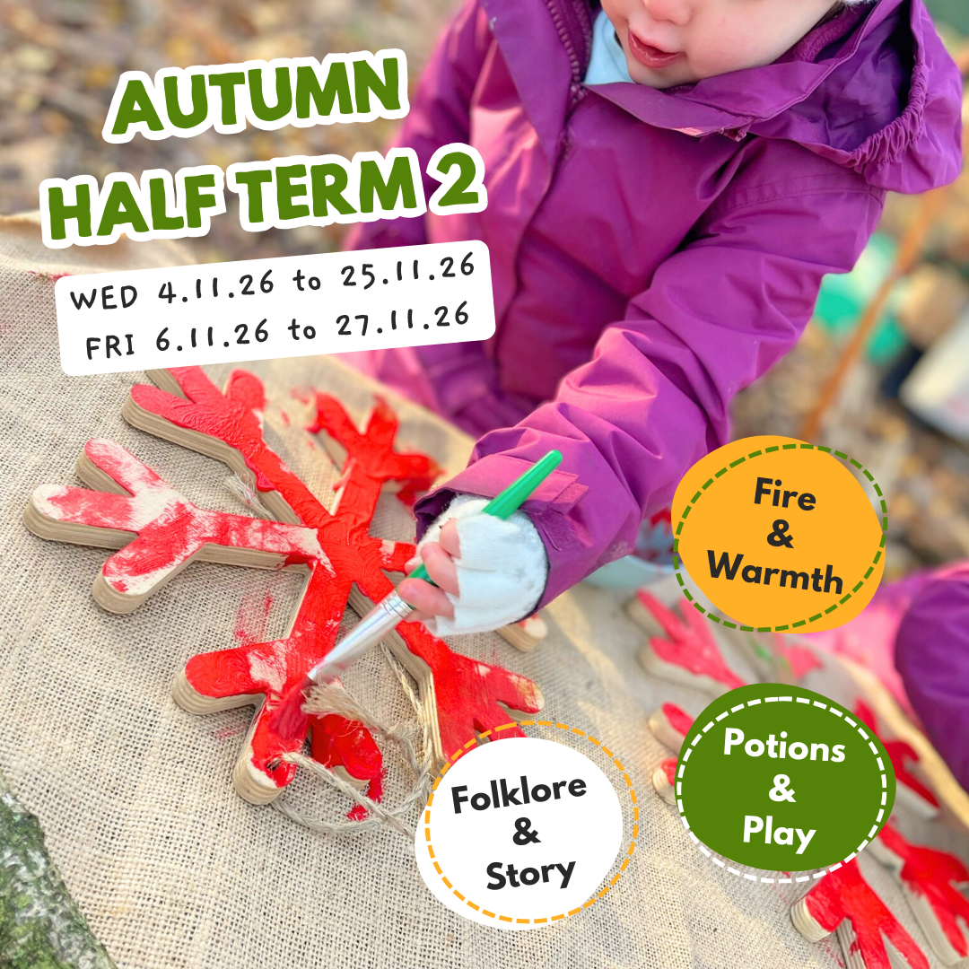 This half-term marks the move into cooler days, with a focus on warmth, gathering and imaginative play. Through fire-based experiences, seasonal stories and creative woodland play, children will explore folklore, mark making and shared rituals, while finding comfort and connection in the changing landscape.