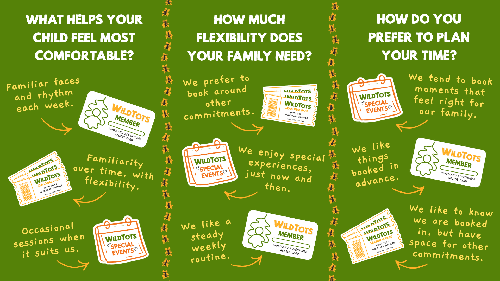 Choose the WildTots Seasonal Pass if you need more flexibility and prefer occasional attendance rather than a fixed weekly place. Both options offer the same high-quality parent-and-child Forest School experience.